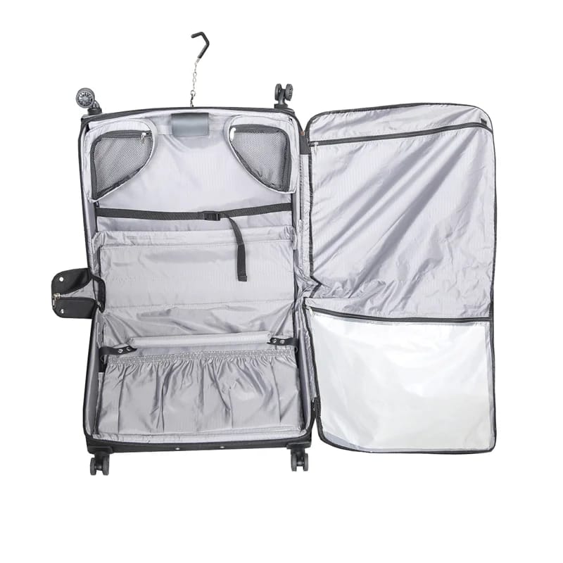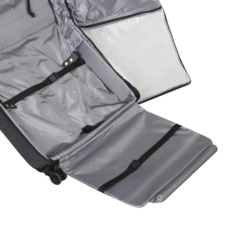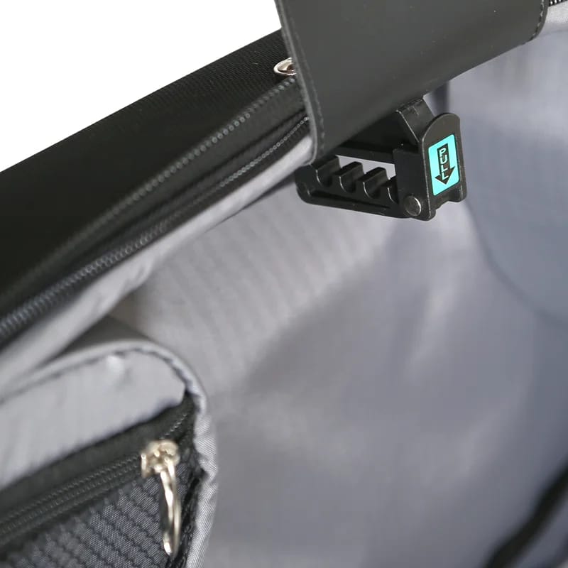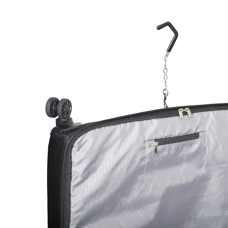 برای حمل این محصول می توانید هم از دسته ای که در بالای کار طراحی شده است و بسیار راحت می باشد و هم از چرخ و دسته ترولی که داخل فضای زیپ دار طراحی شده است، استفاده کنید. و بعد از گذاشتن کت و شلوار در داخل آن از وسط یک تا زده می شود و به صورت زیپ کامل بسته می شود.